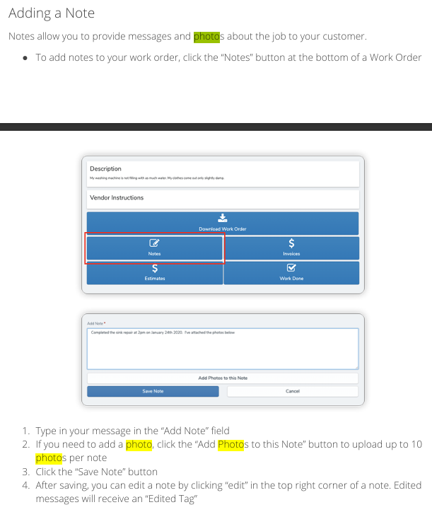 Be sure to add photos prior to your invoice! Once the invoice is processed, the work order will be closed out and completed on our end and no other notes or photos will be able to be added.